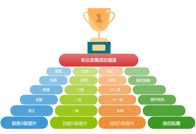 在人力開發(fā)體系的基礎(chǔ)上,集團為保證員工持續(xù)的競爭力、適應性,以及不斷的發(fā)展動力,特開發(fā)了“根源特色”的四條發(fā)展通道。在傳統(tǒng)的“技術(shù)和管理”兩個發(fā)展維度的基礎(chǔ)上,增設(shè)了“崗位五級上升通道”及“崗位拓展/輪換上升通道”。集團的每個員工都可以根據(jù)自己的發(fā)展訴求以及自身特點,選擇發(fā)展通道。“通道內(nèi)部可以上升,之間可以互通”,讓每個員工都能在根源得到職業(yè)的發(fā)展,實現(xiàn)職業(yè)的成功。